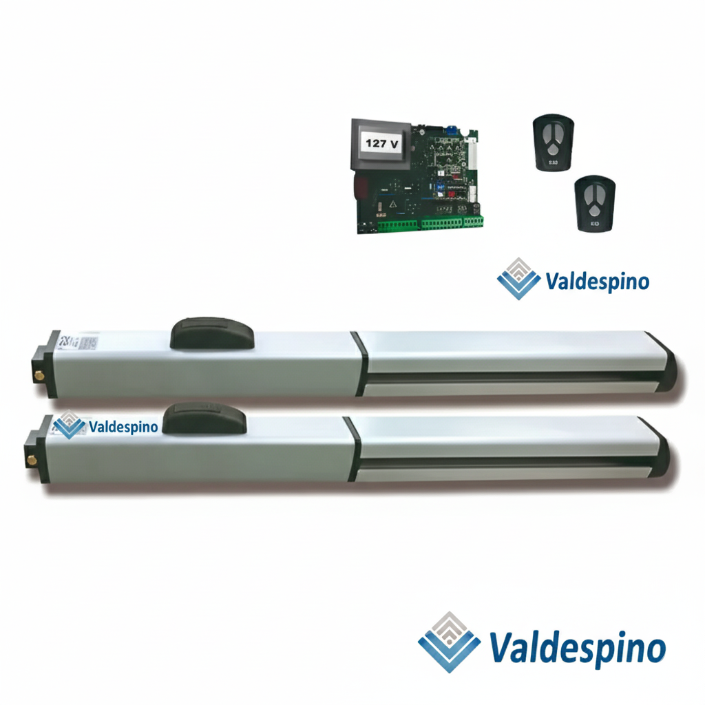 Los pistones son el tipo de automatismo más utilizado en accesos abatibles residenciales. Funcionan mediante brazos telescópicos eléctricos que empujan o jalan cada hoja del portón. Son ideales para instalaciones con columnas anchas o espacios reducidos, ya que se montan directamente sobre los marcos o postes del acceso.